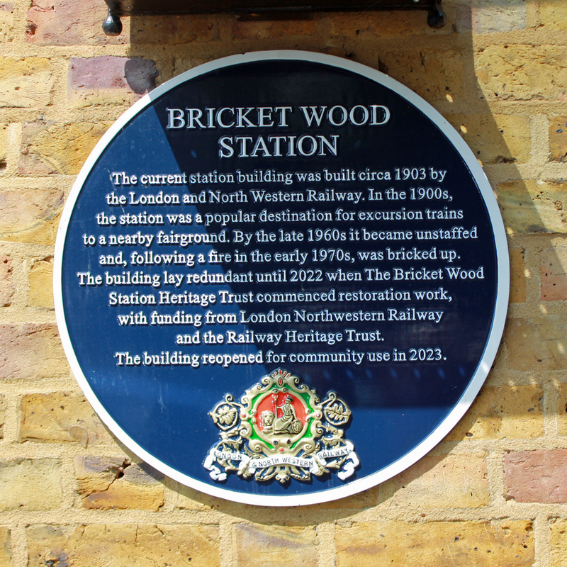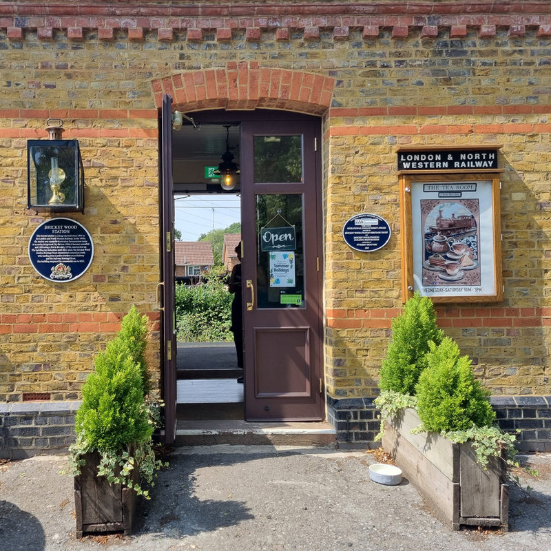 The Branch Party at Bricket Wood, 6th.August 2025 (Image: Chris Jones), with, below, the Bricket Wood Station Tea Room entrance (Image, Bryan Cross), and a close up of its blue plaque (Chris Jones)